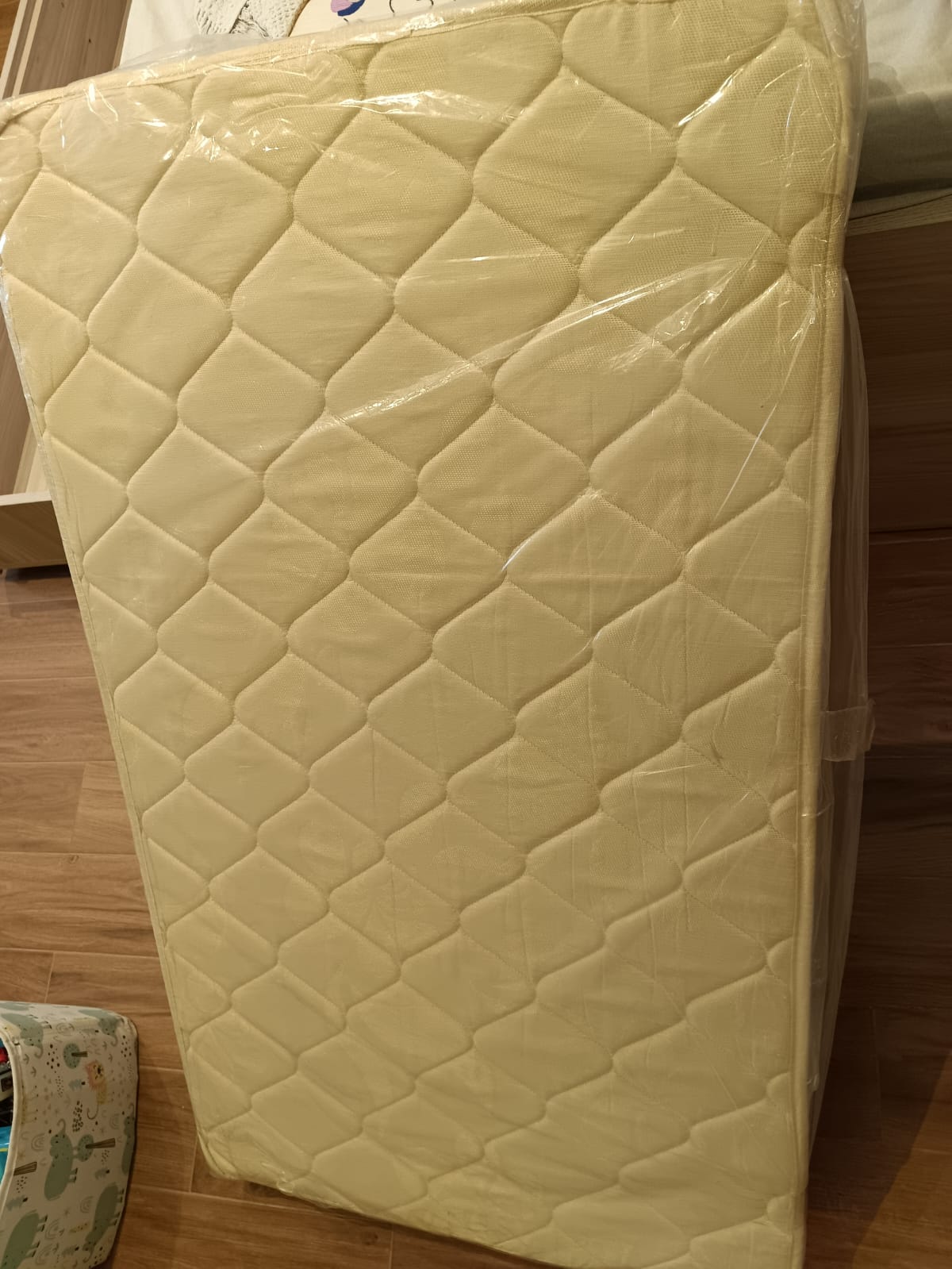 Wooden Baby Crib. White and Grey Color. Dimensions 125x75cm. Mattress and Mosquito Net Included. Tailor Made by Les Ptits Bobos. Super Excellent Condition. Video Available.
