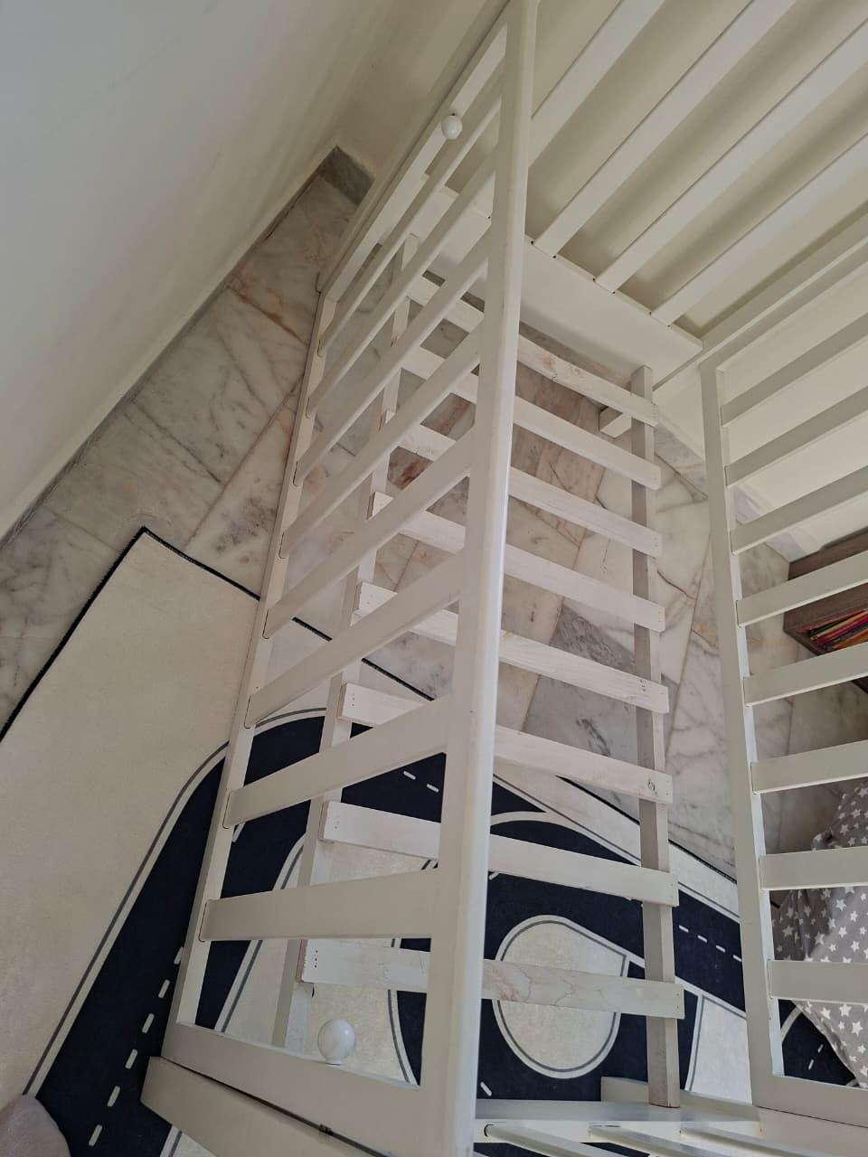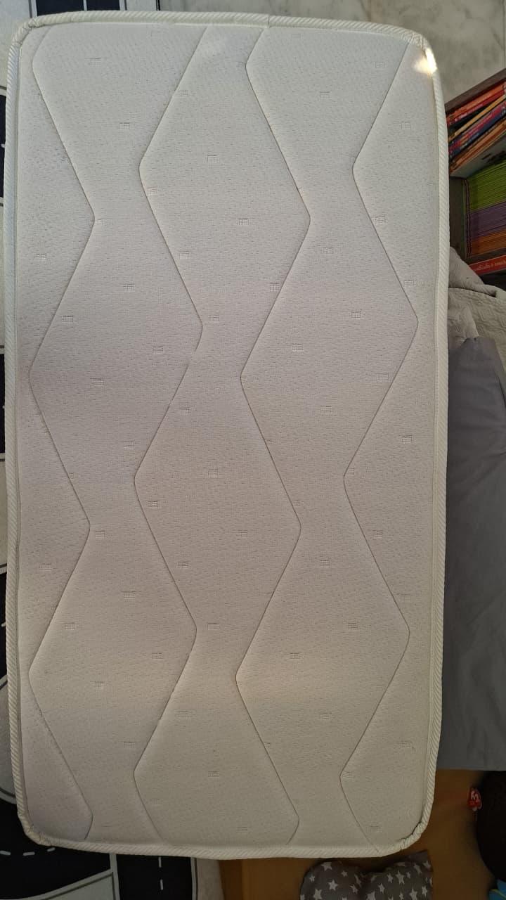 White Crib with Mattress and Mosquito Net Stand. Dimensions 120x60cm. Removable Side and Adjustable for Multiple Levels. Excellent Shape - Shows few signs of usage. Video Available. Original Price 400$.