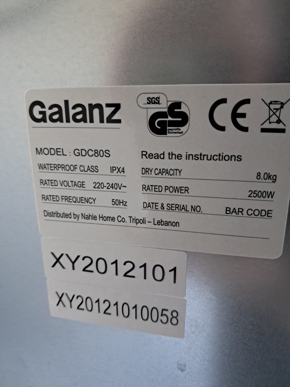 Galanz Brand. Model GDC80S. Silver Color. 8 Kgs Capacity. Stainless Steel Drum - Prevents Bacteria. Condenser Mode - No Installation Needed. Excellent Condition. Original Price 370$.