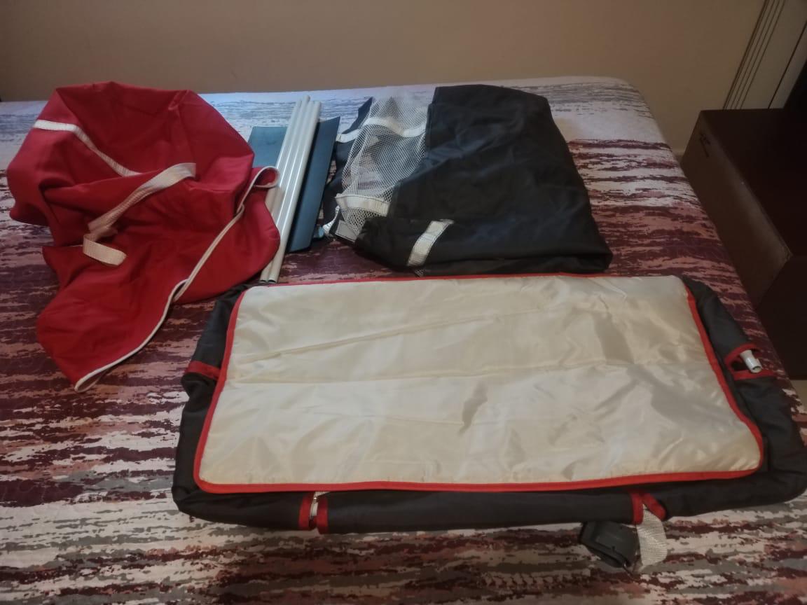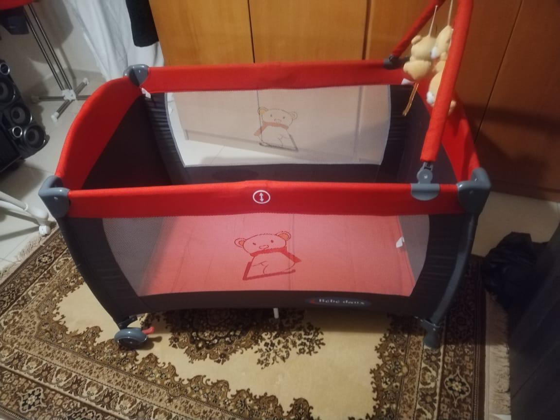 Parc or Travel Cot. Portable Mesh Bed. Bebe Doux Brand. 2 Levels with Accessories. Red and Grey Color. Used for 10 days only for Grandson who came to visit Lebanon. All Accessories were not used. Original Price 150$.