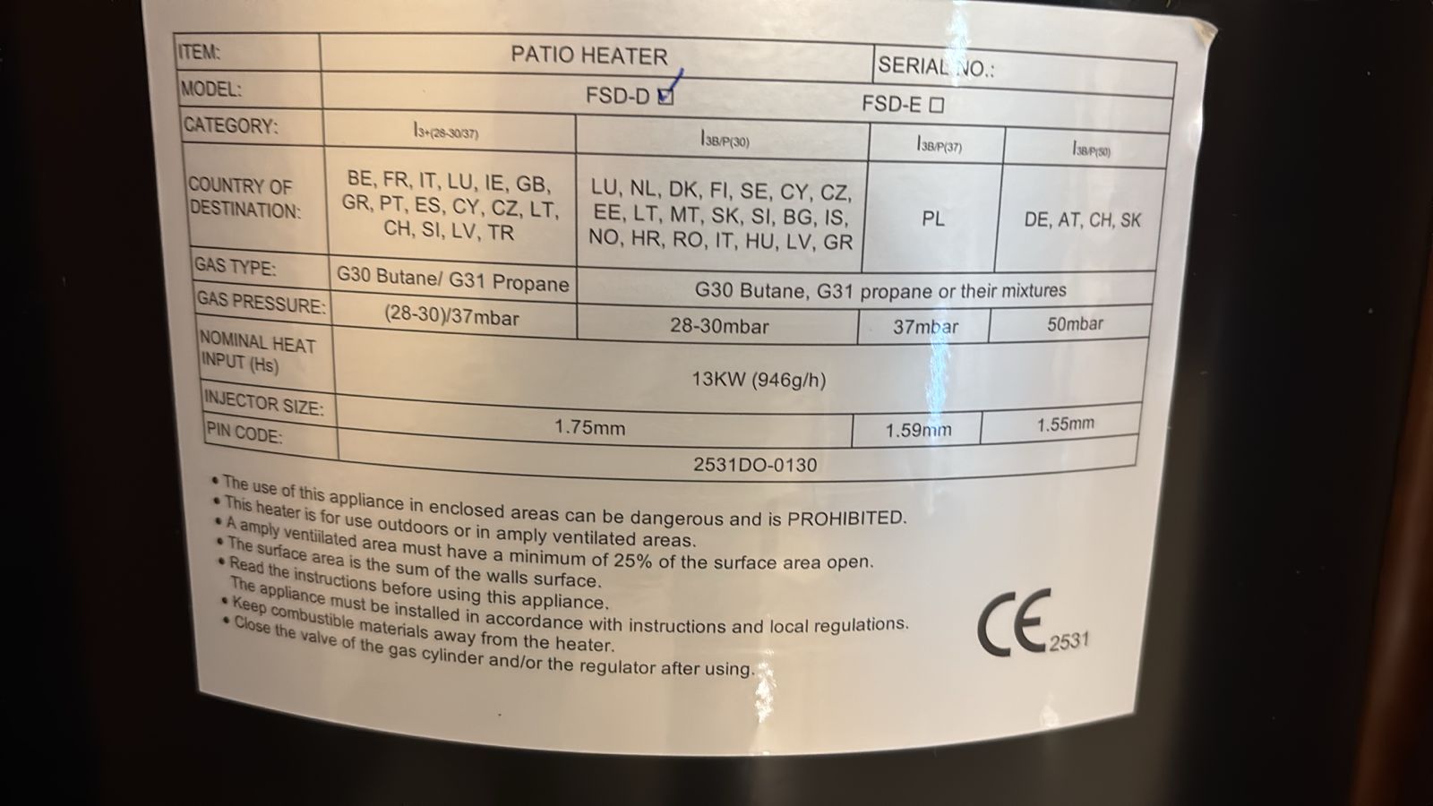 Patio Heater. Perfect for Outdoor Setup or Garden. Model FSD-D. Gas Operating. Used 2 Times Only - Like New Condition. Original Price 225$.