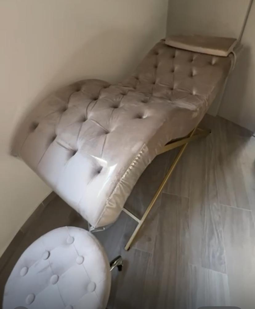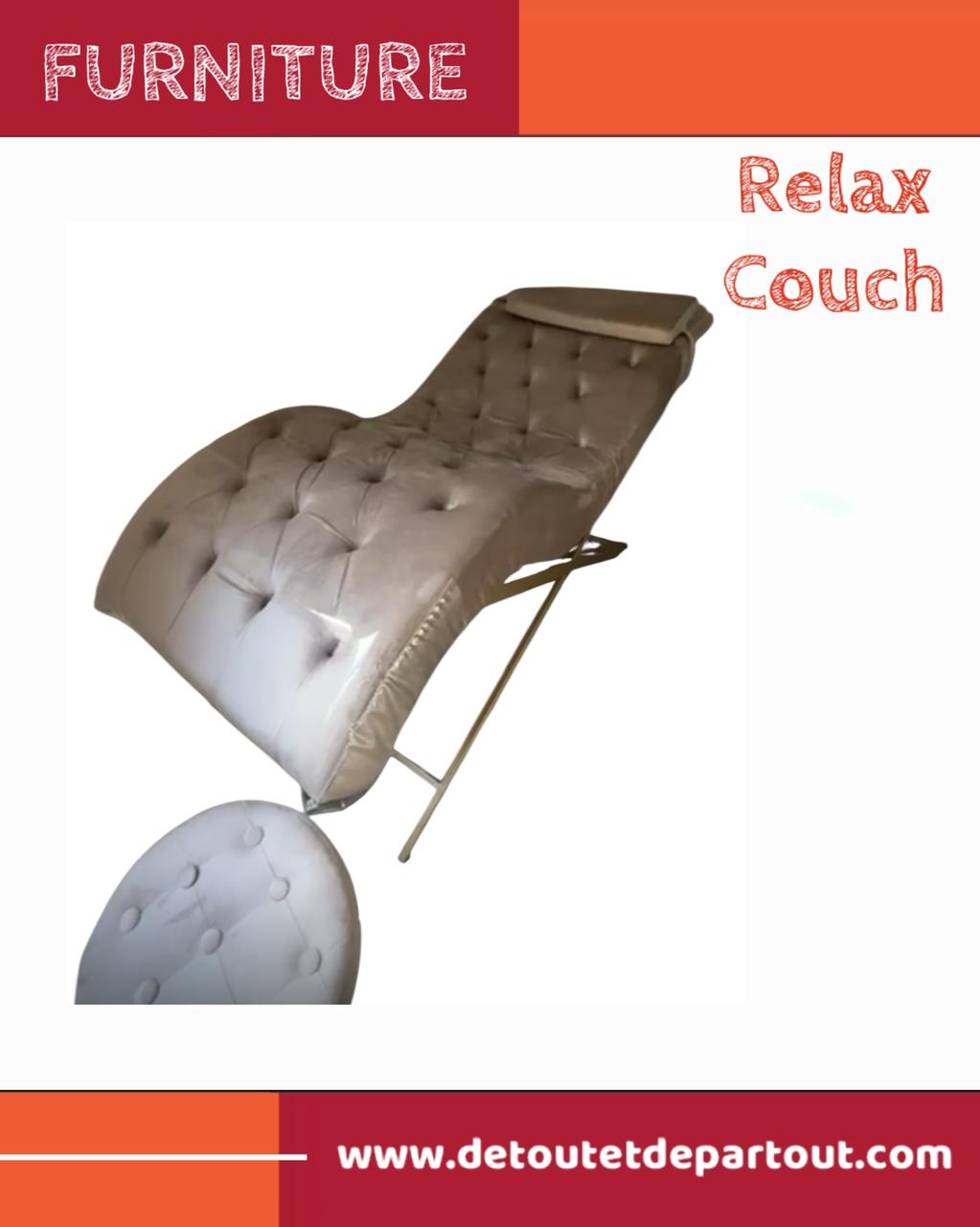 Relax Couch with its Stool. Metal Gold Color and Beige Fabric. Can be Used for Clinic, Make Up, or Chair Alone as Decorative Piece. Brand New - Tailor Made but Not Used. Video Available.