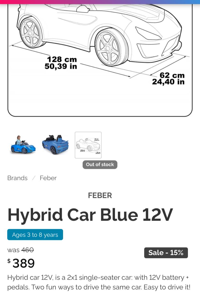 Ride On. Feber Brand - Hybrid Model. Blue Color. 12 Volts - Ride Alone Pedal and Battery. Like New Condition. Market Value 390$.