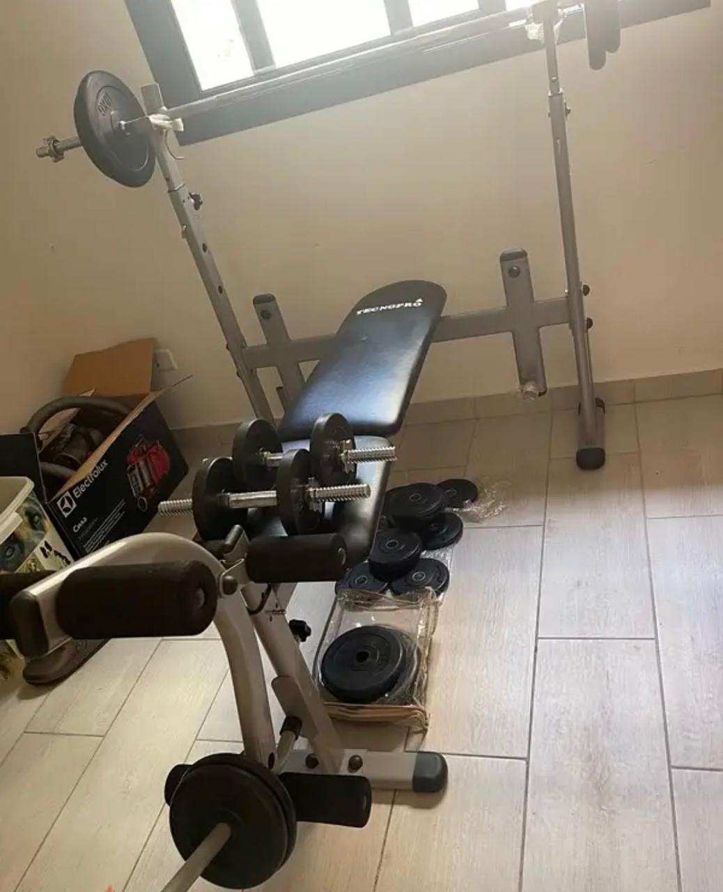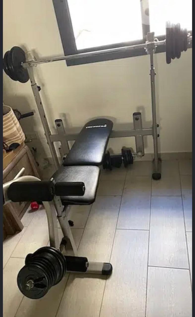 Sports Bench with Axe and Rubber Weights. Dimensions 180x60cm. Weights as per the below: 2x10kgs and 4x5kgs. Excellent Shape.