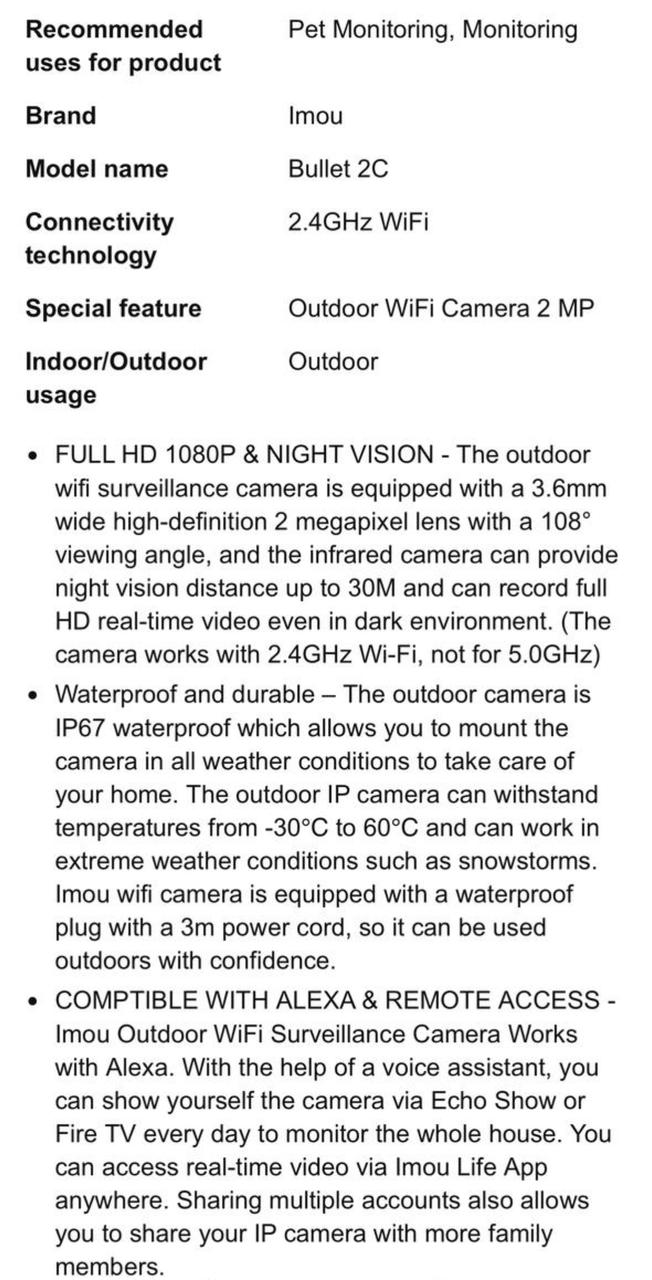 Imov Brand. Set of 2 Surveillance Cameras. Outdoor Usage. Wifi Connected. Bullet 2 C Model. Original Price 100$. Brand New Not Used.